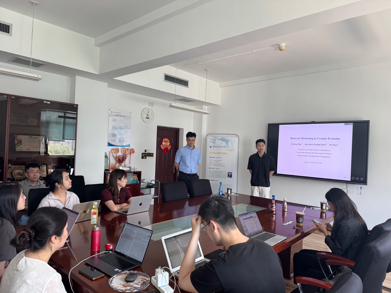 2025年6月11日上午,商学院在学院南路校区主教学楼615会议室成功举办了中央财经大学商学院卓越学术讲坛2025年第十五期讲座。本次讲座邀请了赵璞助理教授作为主讲嘉宾。商学院的教师、研究生参加了此次活动。