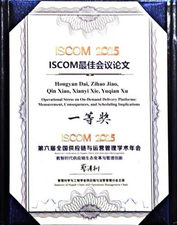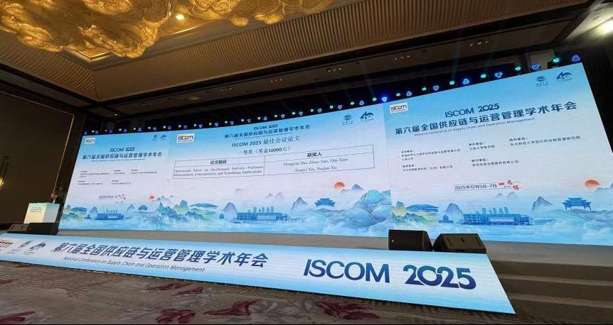 2025年12月6日至7日,第六届全国供应链与运营管理学术年会(iscom 2025)在江苏无锡举行。本届年会以“数智时代供应链生态变革与管理创新”为主题,吸引了来自全国众多高校、科研机构及行业企业的专家学者参会交流。我校商学院教授代宏砚教授与北京工商大学焦子豪副教授、研究生谢先一、江西财经大学肖沁助理教授、北卡罗来纳大学教堂山分校徐雨茜长聘副教授的合作论文“operational stress on on-demand delivery platform management, consequences, and scheduling implications”获得iscom2025最佳会议论文一等奖。