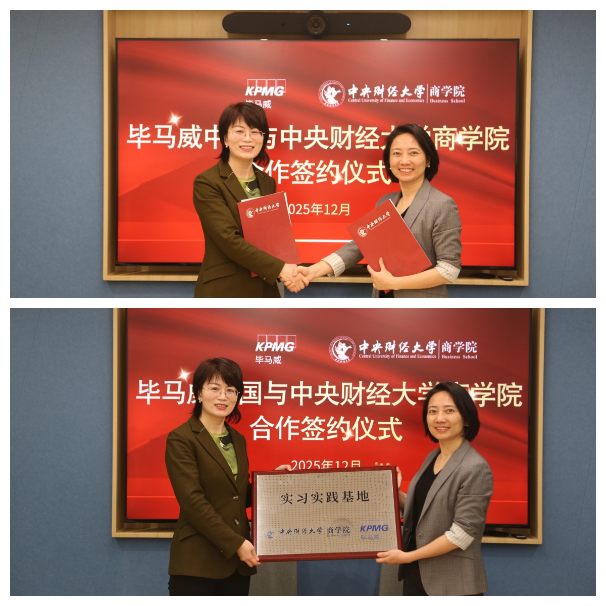 2025年12月24日,中央财经大学商学院与毕马威华振会计师事务所(特殊普通合伙)实习基地签约暨授牌仪式在毕马威北京办公室顺利举行。双方代表围绕校企协同育人、产学研深度融合展开务实交流,并就共建实习实践平台、创新人才培养机制达成多项共识。此次签约标志着双方在推动人才培养、资源共享方面迈出实质性一步。