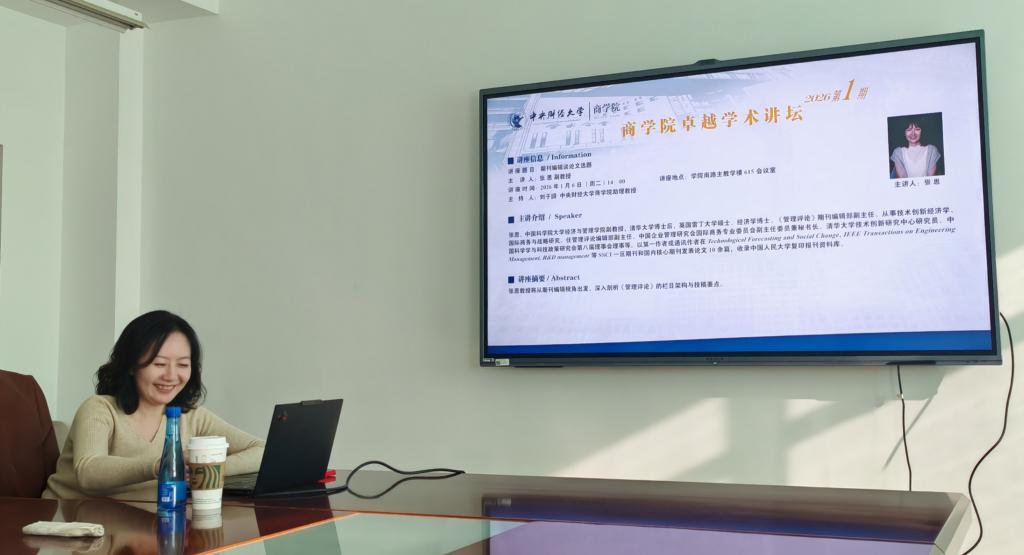 2026年1月6日(周二)下午2点,中央财经大学商学院在学院南路校区主教学楼615会议室顺利举办了2026年第1期卓越学术讲坛。本次讲座特邀中国科学院大学经济与管理学院副教授、《管理评论》编辑部副主任张思担任主讲嘉宾。商学院的教师、博士生、硕士生以及其他高校的学者共计10余人参加了此次学术活动。