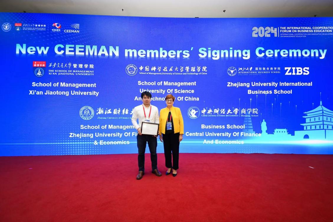 during the opening ceremony, the organizers held an induction ceremony for new members of ceeman. professor lin song, dean of cufe business school, received the ceeman membership certificate on behalf of cufe business school from professor danica purg, president of ceeman.