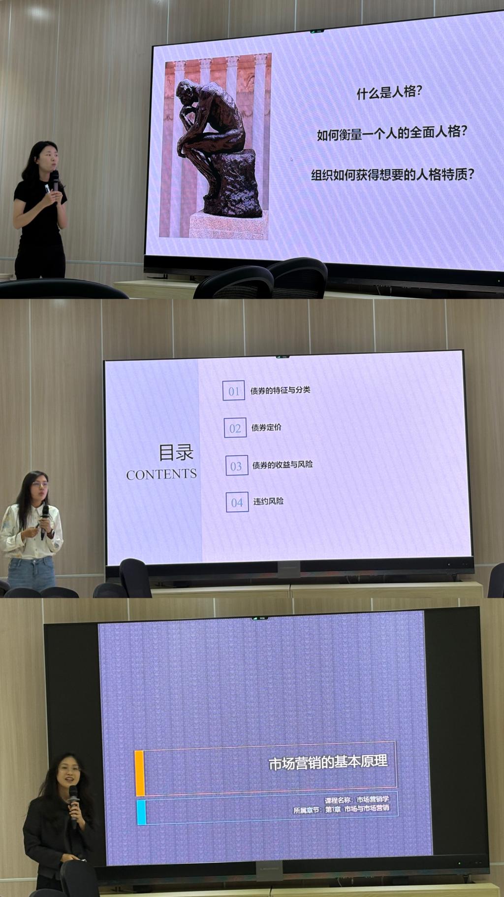 after selection and recommendation by each department, three young teachers—dr. ji yueting from the department of organization and human resource management, dr. gao zhennan from the department of finance and financial management, and dr. ling ruobing from the department of marketing—ultimately qualified for the competition. the competition invited prof. zhu fei, an excellent instructor of the 13th beijing young teachers' teaching basic skills competition; dr. li jiapeng, a first-prize winner of the beijing young teachers' teaching basic skills competition; prof. zhang shujun, a senior teacher deeply engaged in teaching at the school; and members of the school's teaching committee as review guests. prof. gu leilei, director of the undergraduate program of the school, served as the host of the competition.