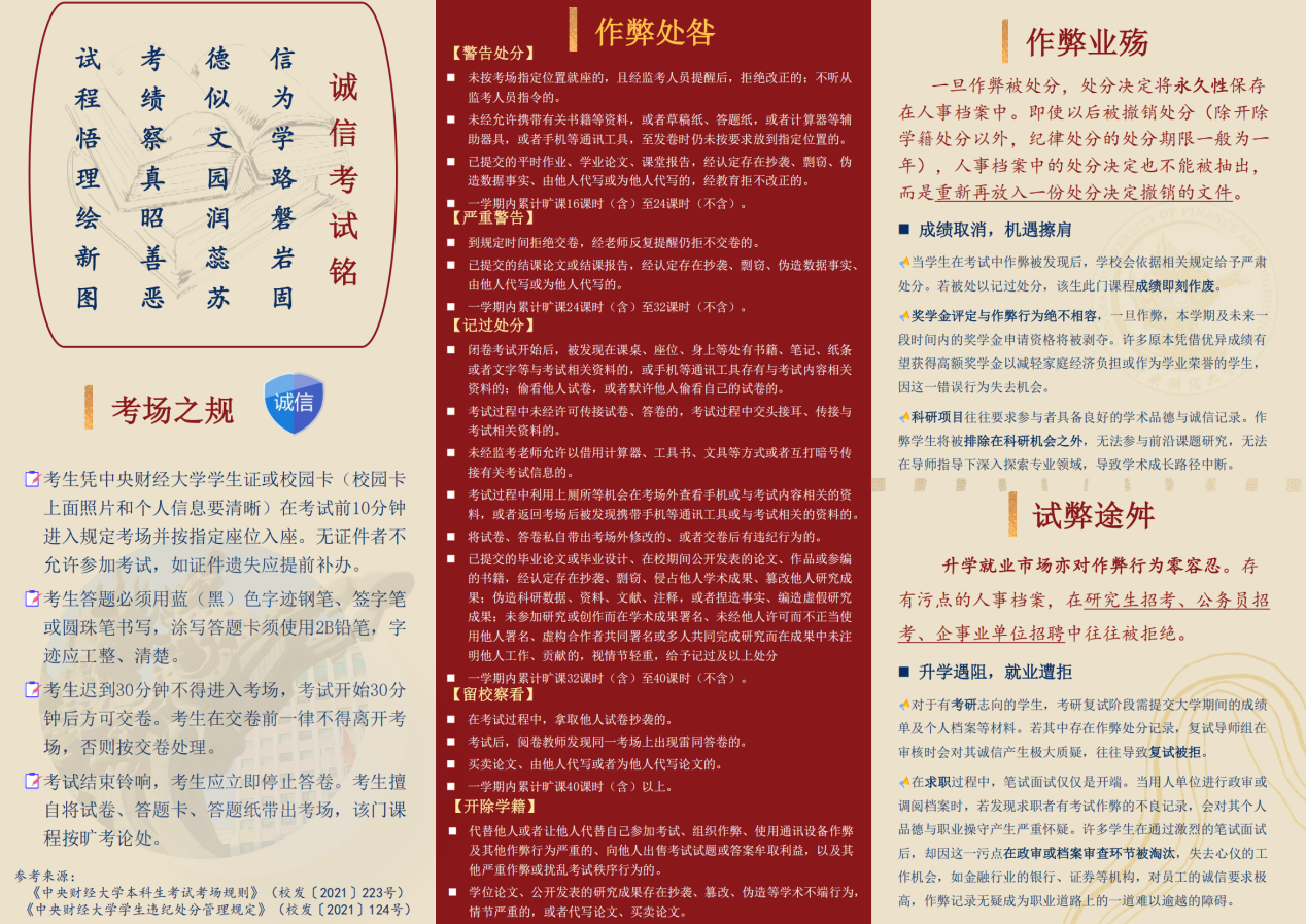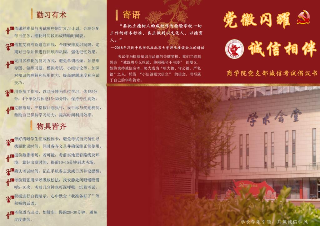 为让大一新生深刻理解学术诚信的重要性,本科生第一党支部精心制作了《商学院党支部诚信考试倡议书》折页。这份折页不仅详细阐述了诚信考试的意义,还介绍了学术不端行为的严重后果,着重强调了考试期间应遵守的基本规范。此外,折页中还包含了相关的学习资源、图书馆服务以及考试前的准备工作提示,帮助新生们高效备考,提升自身的综合素质。
