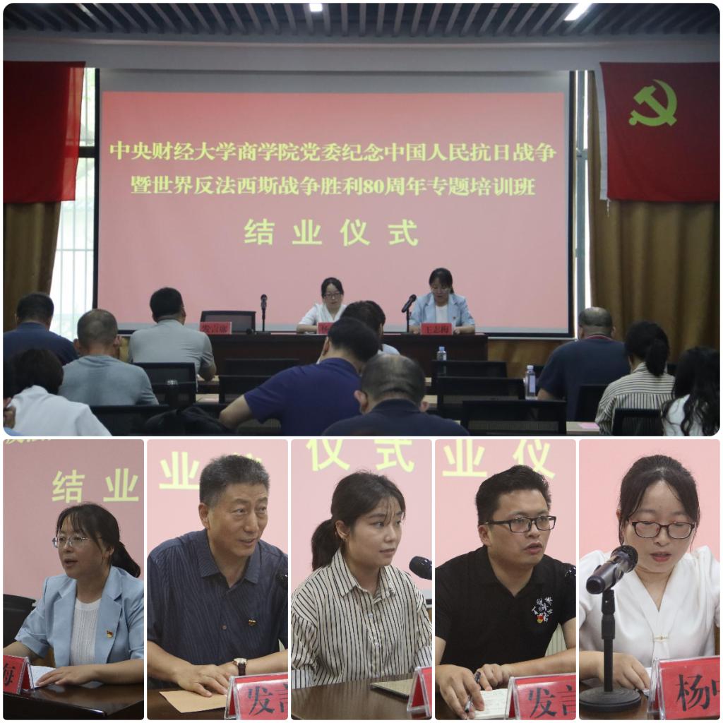 结业式由商学院党委组织员王志梅主持,人力与组织管理系季晓得助理教授、mba学生党支部纪检委员曾功星和战略系庞守林教授分享了培训收获和体会。商学院党委副书记、纪委书记杨中英作总结,她回顾了培训过程,肯定了学员们在学习中的投入与收获,希望大家以此次培训为起点,将抗战精神转化为推动学院党建提质增效、事业高质量发展的实际行动。