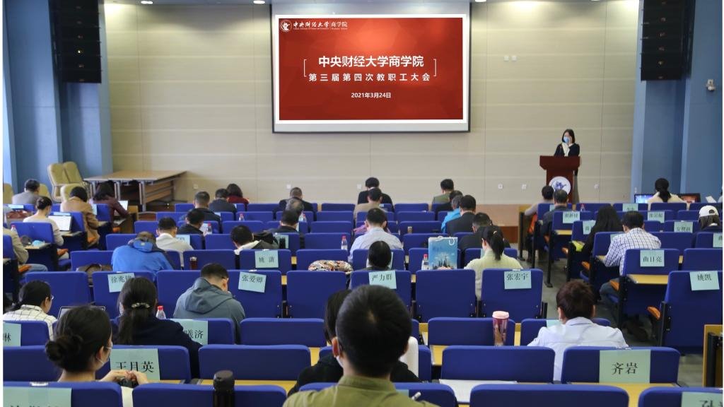 2021年3月24日,商学院第三届第四次教职工大会在学术会堂402如期举行。学院领导班子、全体教师出席会议,学院党委副书记杨中英主持会议。 大会开始,奏唱国歌 党委副书记杨中英主持会议 在庄严的国歌声中,大会开始,党委书记葛建新向大会致辞。首先,葛建新书记热烈祝贺此次教职工大会的召开。她表示学院一直积极落实上级工作,设立二级教代会,并充分发挥二级教代会的作用,为学院的发展出谋划策。学院始终将党建工...